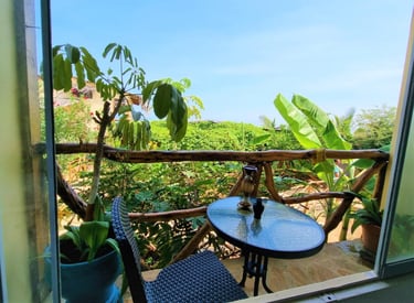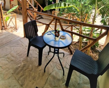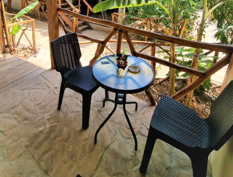 Esta es la Habitación 2, un bungalow de tamaño intermedio con terraza privada y vista parcial al mar. Ideal para quienes desean privacidad, comodidad y un ambiente relajado con brisa marina.