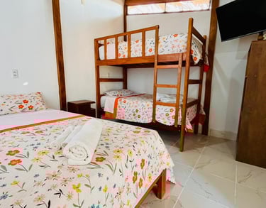 Esta es la Habitación 4, un bungalow amplio pensado para familias o grupos pequeños. Cuenta con una distribución funcional y un ambiente cómodo y seguro, ideal para disfrutar una estadía en conjunto frente al mar.