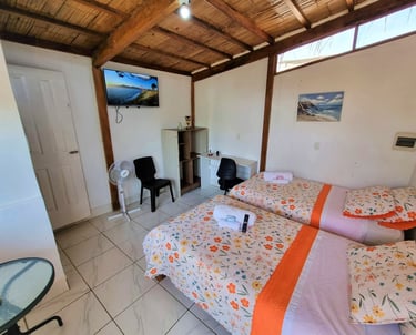 Esta es la Habitación 8, un espacio acogedor y privado diseñado para parejas o viajeros que buscan una estadía sencilla pero confortable frente al mar. Perfecta para descansos cortos y escapadas tranquilas.