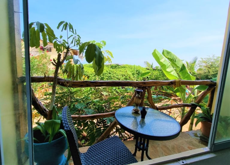 Esta es la Habitación 10, un bungalow de tamaño intermedio con terraza privada y vista parcial al mar. Ideal para quienes desean privacidad, comodidad y un ambiente relajado con brisa marina.
